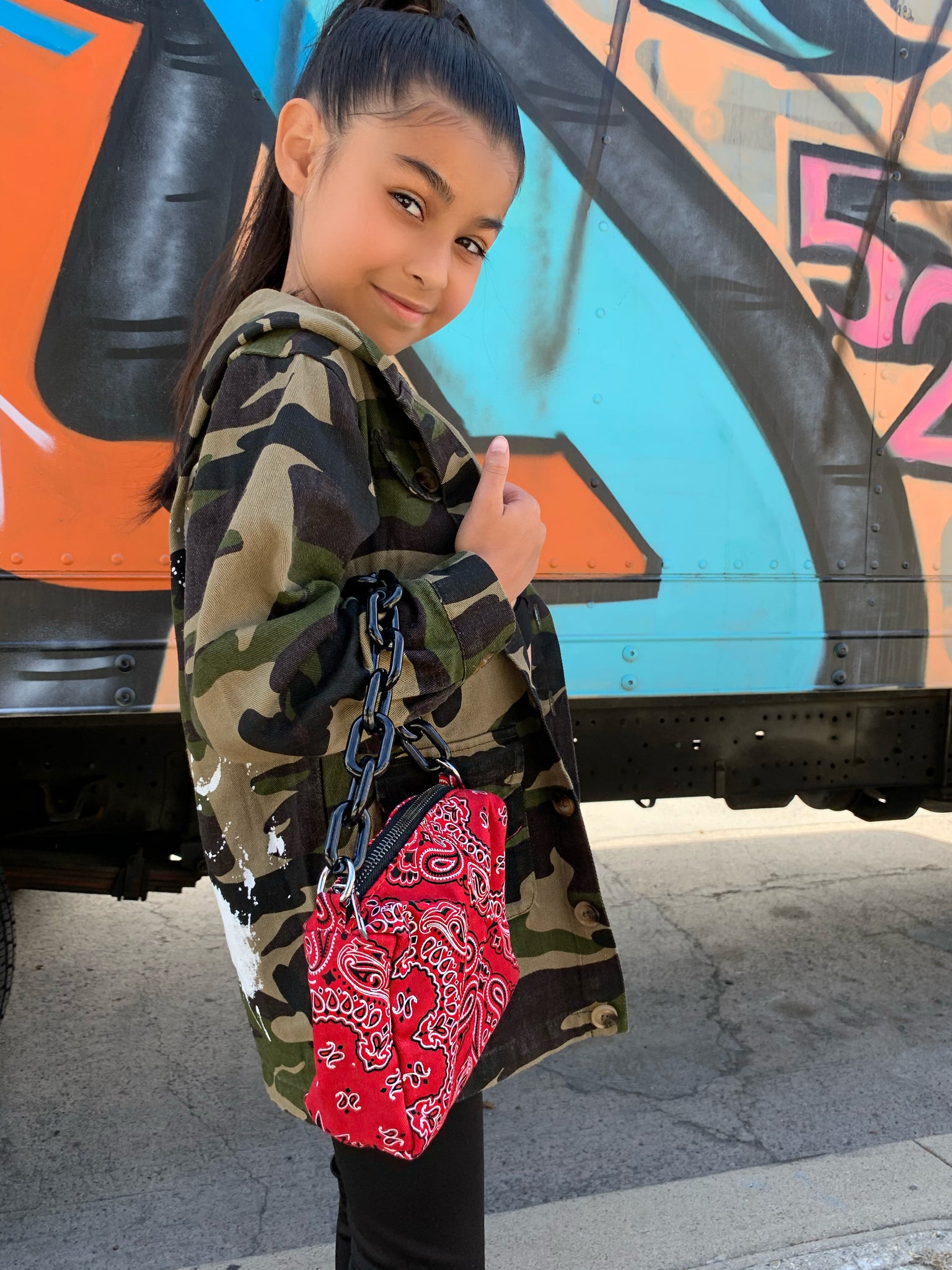 Trendy mini bandanna print street style purse. Comes with extra sliver chain strap for a crossbody look.